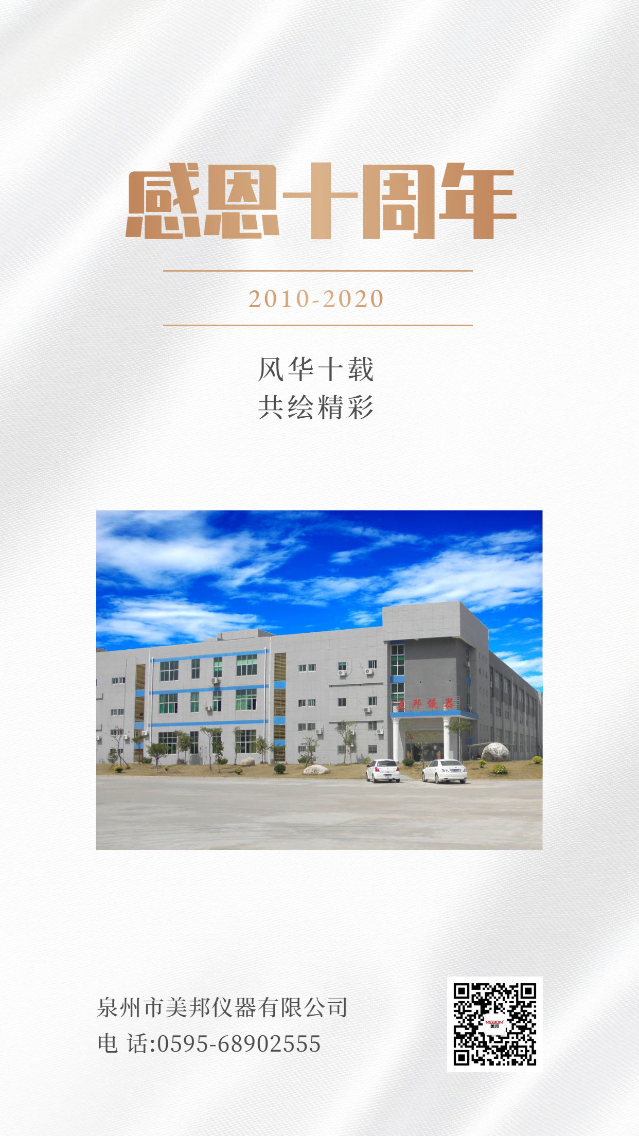 2020年5月7日,迎來了我們美邦儀器的十周年生日。十年,我們一起走過波瀾壯闊的征程,十年,我們一起譜寫繁榮昌盛的篇章。從2010年到今天我們努力擴(kuò)展廠房、積極開發(fā)新產(chǎn)品、不斷完善員工福利,一路走來我們一直在進(jìn)步,從未停止攀登。