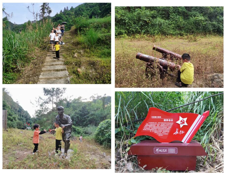 路的兩旁每隔一段路程,豎立著長征重大事件歷史記錄,紅軍革命歷史博物館外圍豎立著三面旗幟,隨風(fēng)飄蕩,讓人肅然起敬,往里走,有座土石疊成的房子,大門上掛著牌匾—【長征故事】,房子旁豎立著“不忘初心、牢記使命”以及“入黨誓詞”,之后我們進(jìn)行全體合照。