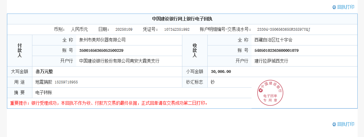 全球性經(jīng)濟(jì)寒冬,大家生活、發(fā)展都不易!西藏日喀則地區(qū)發(fā)生地震讓當(dāng)?shù)厝藗兏茄┥霞铀?!美邦儀器牢記使命,不忘初心!捐款3萬元略表心意!祝災(zāi)區(qū)人民早日恢復(fù)正常生活!