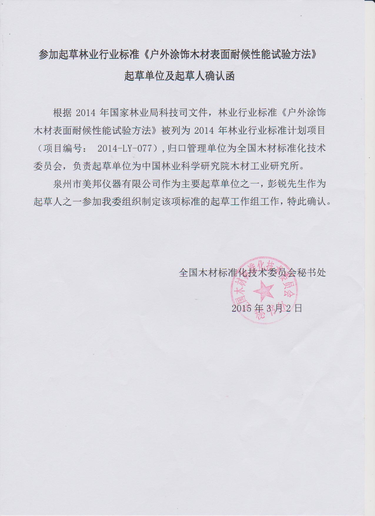 美邦儀器作為主要起草單位之一,公司總經(jīng)理彭銳歷經(jīng)千辛萬(wàn)苦,經(jīng)過(guò)多年的反復(fù)論證,通過(guò)不斷地修正,才得以定稿成型。所撰寫的《戶外涂飾木材表面耐候性能試驗(yàn)方法》、《戶外涂飾木材表面質(zhì)量等級(jí)與評(píng)價(jià)方法》兩標(biāo)準(zhǔn),被列入2014全國(guó)林業(yè)行業(yè)標(biāo)準(zhǔn)計(jì)劃項(xiàng)目,編號(hào)分別為2014-LY-077、2014-LY-078。據(jù)了解,該標(biāo)準(zhǔn)主要負(fù)責(zé)單位為中國(guó)林業(yè)科學(xué)研究院木材工業(yè)研究所。