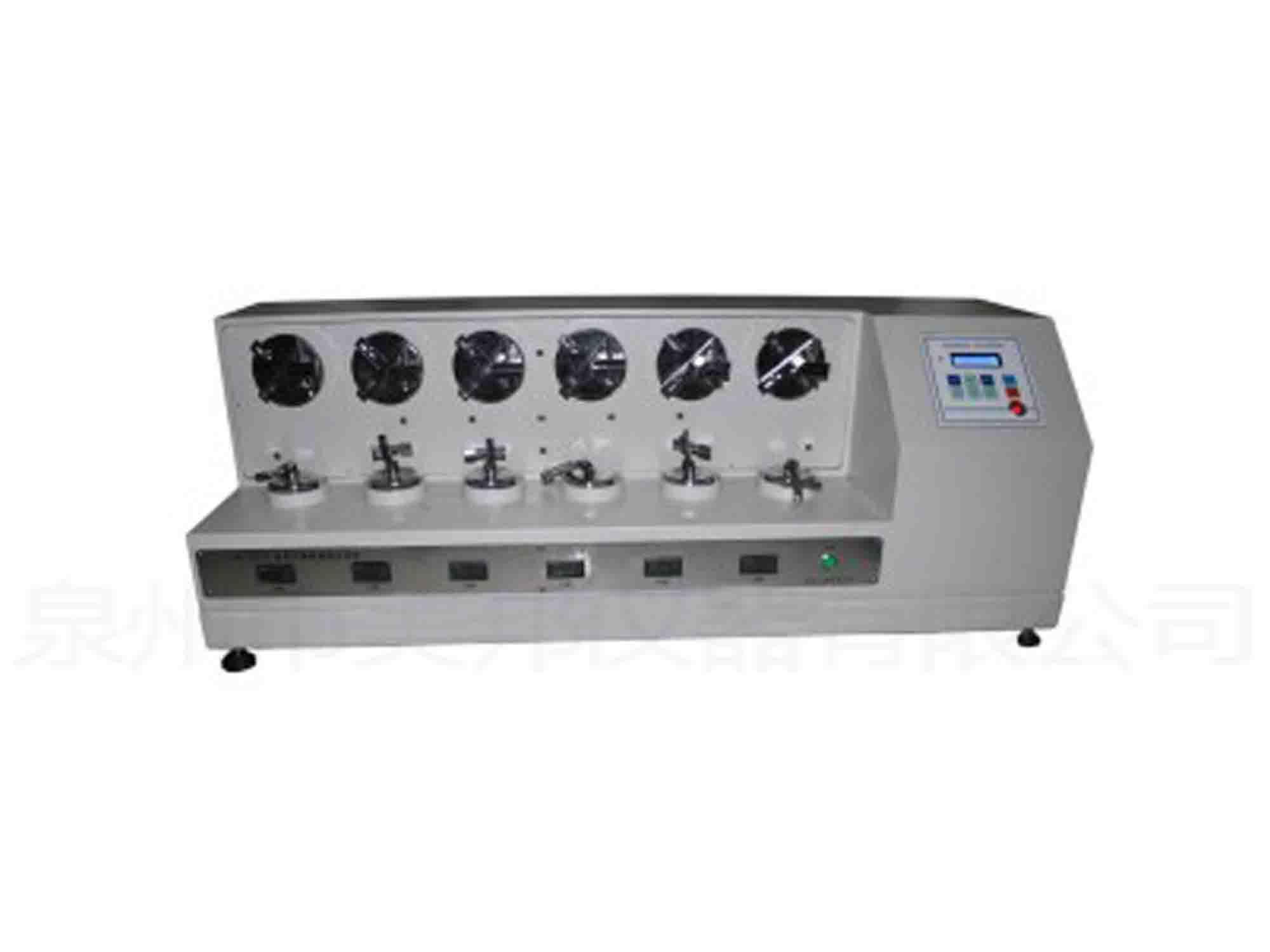 本機(jī)是用來測試皮鞋、休閑鞋及慢跑鞋等中底纖維板的耐曲折特性。試驗(yàn)方式為在一特定荷重下將試件向左及向右連續(xù)各曲折90°直到試件破壞時(shí),以其曲折次數(shù)作為此中底板的耐曲折指數(shù),以當(dāng)作中底板的比較和選購的參考。