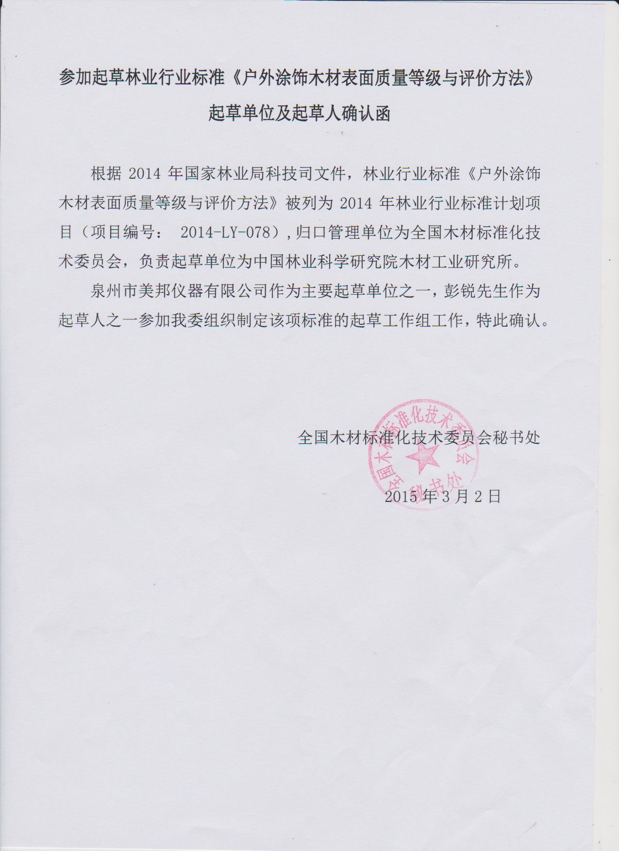 美邦儀器作為主要起草單位之一,公司總經(jīng)理彭銳歷經(jīng)千辛萬(wàn)苦,經(jīng)過(guò)多年的反復(fù)論證,通過(guò)不斷地修正,才得以定稿成型。所撰寫的《戶外涂飾木材表面耐候性能試驗(yàn)方法》、《戶外涂飾木材表面質(zhì)量等級(jí)與評(píng)價(jià)方法》兩標(biāo)準(zhǔn),被列入2014全國(guó)林業(yè)行業(yè)標(biāo)準(zhǔn)計(jì)劃項(xiàng)目,編號(hào)分別為2014-LY-077、2014-LY-078。據(jù)了解,該標(biāo)準(zhǔn)主要負(fù)責(zé)單位為中國(guó)林業(yè)科學(xué)研究院木材工業(yè)研究所。