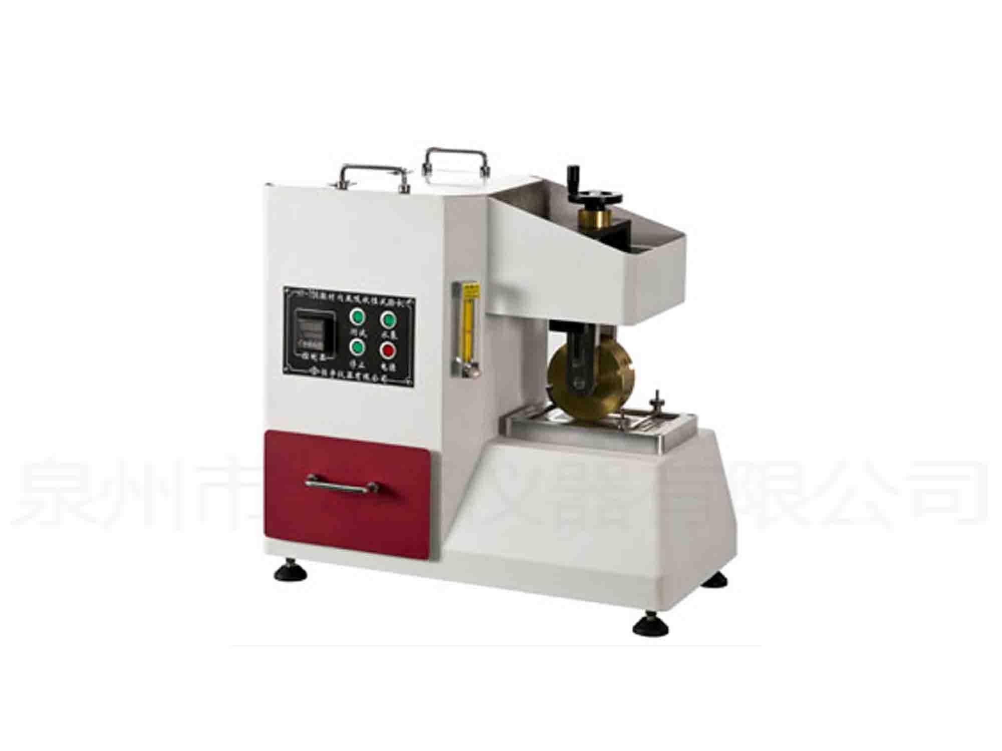 This machine is used to test the water absorbability and hydrolytic absorbability of the inner and inner lining of the shoe, the principle is that the specimen is placed on a wet floor, subjected to repeated bending under a certain pressure (like the appearance of the bottom of the shoe on foot). The flow rate can be adjusted and the flow rate is displayed by a flowmeter, and the time can be set, and the machine will be automatically stopped after the time of arrival.